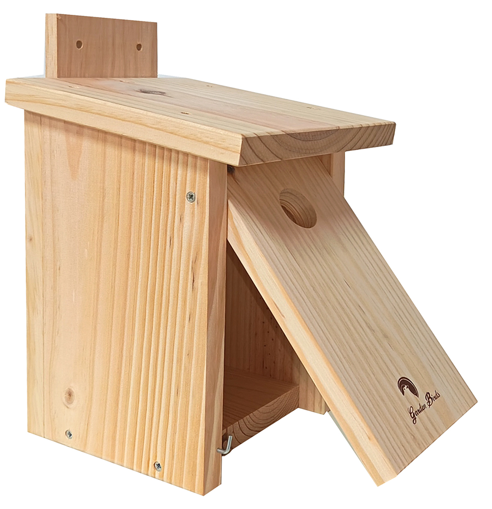Caja nido para pájaros destinada principalmente a albergar diferentes especies de aves silvestres. Su diseño está pensado más para ser clavada en el árbol o pared, todo y que también se podría colgar. Se aconseja utilizar este modelo en zonas de fuerte viento, ya que al poderse clavar evitamos un excesivo balanceo, el cual haría desistir a los pájaros a utilizarla como base de nidificación. Puede colocarse tanto en zonas urbanas (parques, jardines, terrazas, etc.) como en bosques, o bien como ayuda en el control de plagas en huertas y zonas agrícolas (ver control de plagas biológico). Disponible en dos diámetro de entrada: 26mm y 32mm